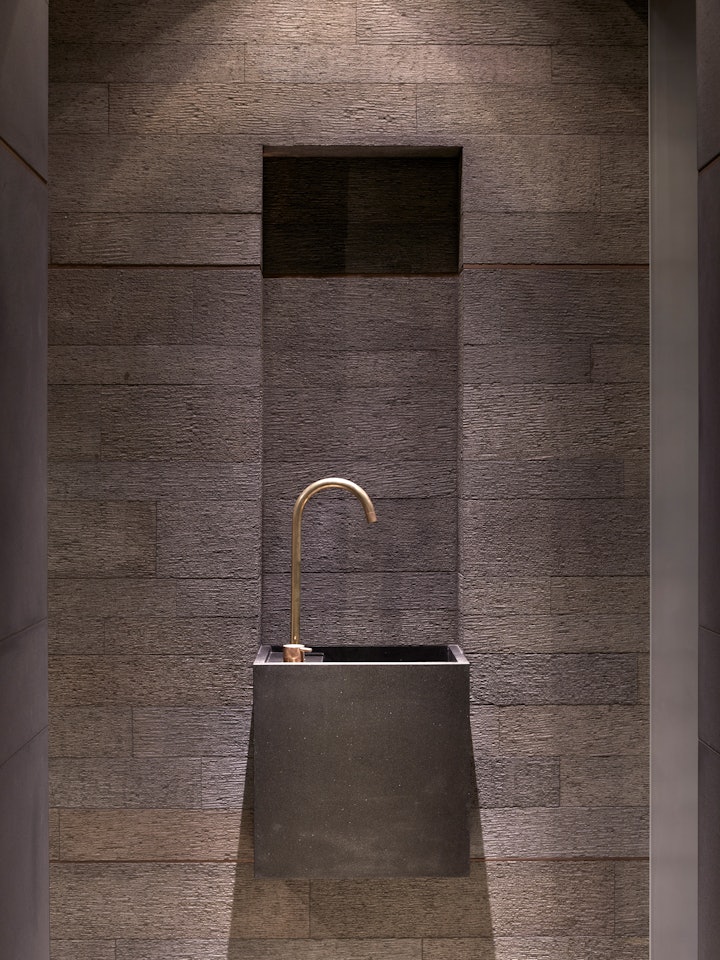 The spa area plays with different shades and finishes of Lava to produce an atmospheric theatrical effect, whilst the master bathroom is decked out in Silk Georgette limestone, including a customised Onsen basin.