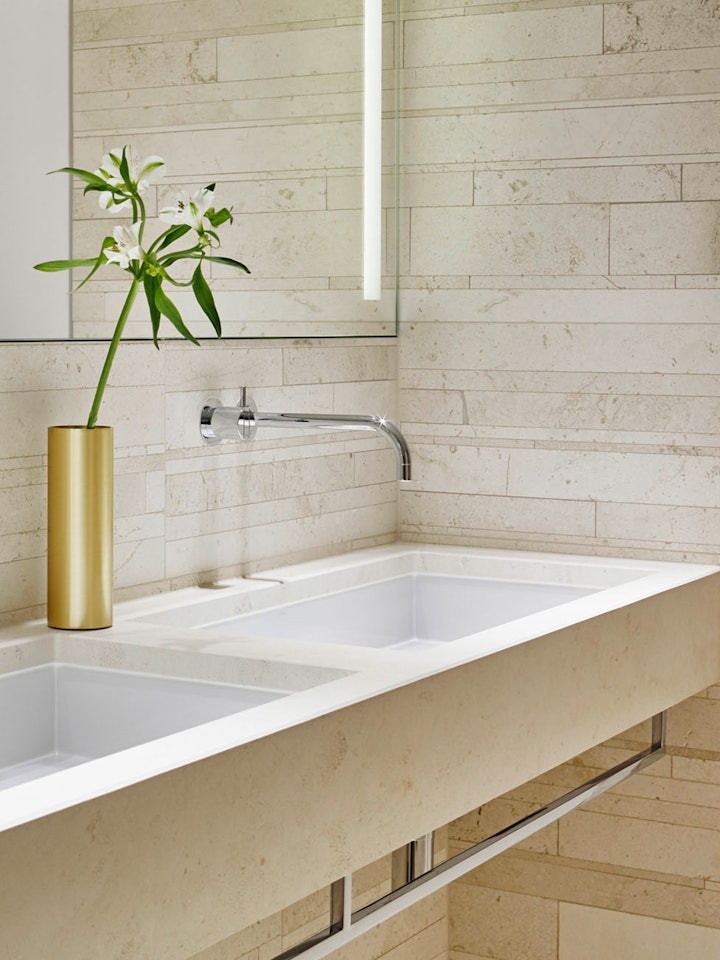 Using natural products wherever possible, the theme of warmth and cosiness continues, including the choice of stone which just happens to be Crema d’Orcia, our lovely creamy-coloured limestone. We supplied over 3000 square metres of it in honed, sandblasted and our Lithoverde® finishes. It fits the bill perfectly: elegant, warm and cossetting, and of course with an added bonus: our Lithoverde® is 99% composed of offcuts meaning that the hotel not only looks after the wellbeing of its guests but also the environment.