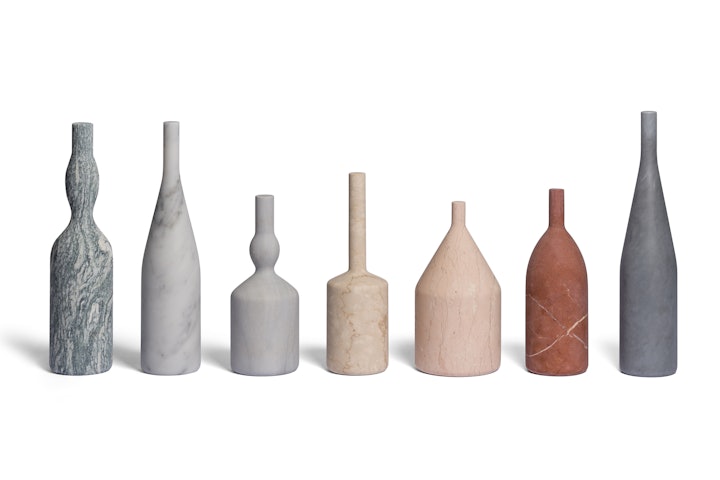 Working closely with Salvatori, Ossino developed a range of objects that take their form from Morandi’s paintings, realising the idiosyncratic shape of his bottles in three-dimensions. Each carefully crafted from a different natural stone – ranging from the muted elegance of Bianco Carrara to the dramatic patterning of Cipollino and the delicate craquelure of Rosa Perlino – the seven bottles are the result of what Ossino describes as a “very interesting investigation into the different textures of marble” which involved visiting the quarries at Pietrasanta in Tuscany with CEO Gabriele Salvatori.